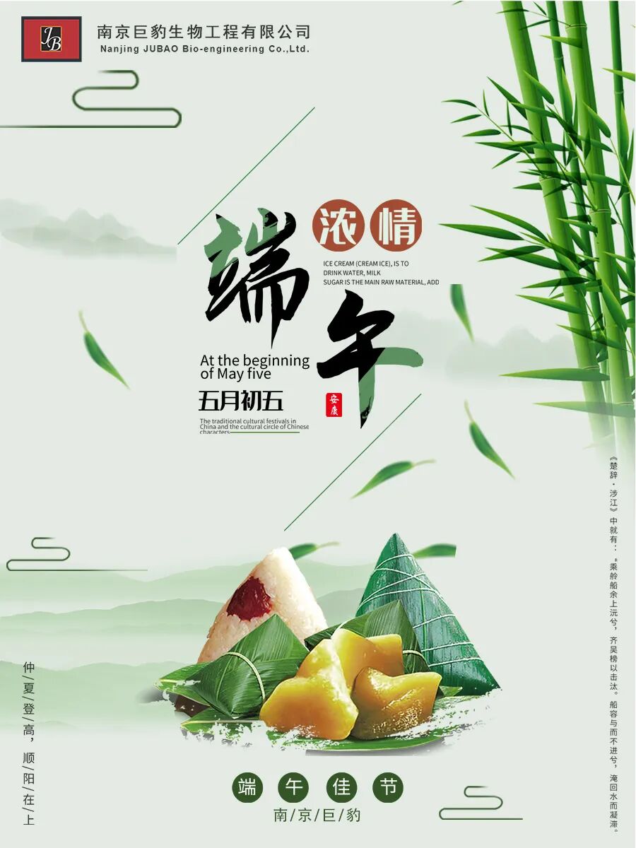 端午节到了,南京巨豹生物工程有限公司董事长秦生巨先生,携手全体员工,祝您端午安康!愿您粽是快乐,粽是幸福,粽是惬意,粽是平安!